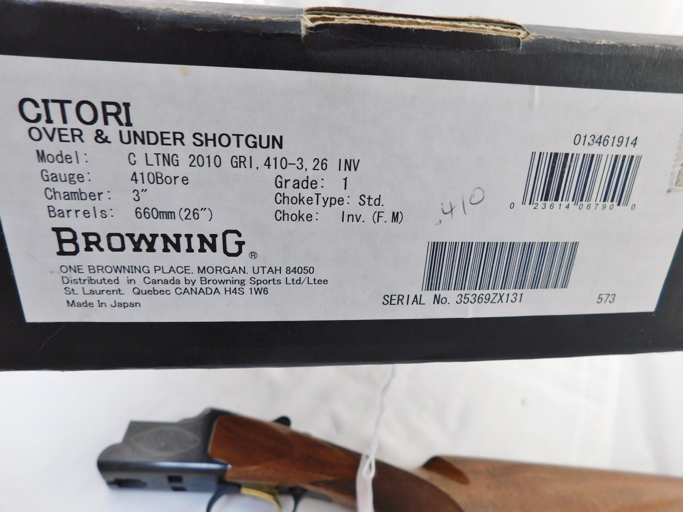 This is a Browning citori 410 with 26 inch invector choke barrels. This gun is 99%+ in the box. Serial # is 35xxxZX131. Buyer pays 60.00 shipping,. Thank you. 59-11-8
